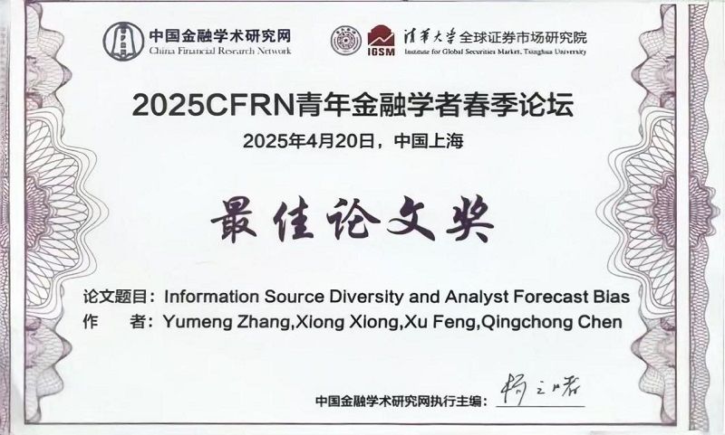 此外,团队工作《Information Source Diversity and Analyst Forecast Bias》(作者:张雨萌博士生、熊熊教授、冯绪教授、陈庆冲博士生)也在此前分别于2025年CFRN青年金融学者春季论坛、FMCG 2025中获评会议优秀论文。该工作聚焦于中国分析师报告中的数据来源数量,并发现其对于预测偏差的缓解作用。