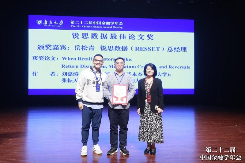 张永杰教授、博士生张耘天与西交利物浦大学刘嘉涛博士、澳门大学赵珅副教授合作的论文《When Retail Investors Strike: Return Dispersion, Momentum Crashes, and Reversals》亦受邀在第二十二届中国金融学年会“上进行汇报。该论文创新性地构建了一个可事前衡量市场层面个体投资者参与程度的指标,并在时间序列分析中发现个体投资者的过度参与会强化短期反转效应、削弱动量效应,为长期困扰中国及其他新兴股票市场的“动量消失之谜”提供了新的解释。该论文经过严格评审,从1535篇投稿中脱颖而出,荣获第二十二届中国金融学年会“锐思数据最佳论文奖”。