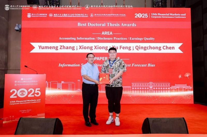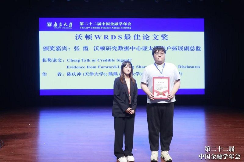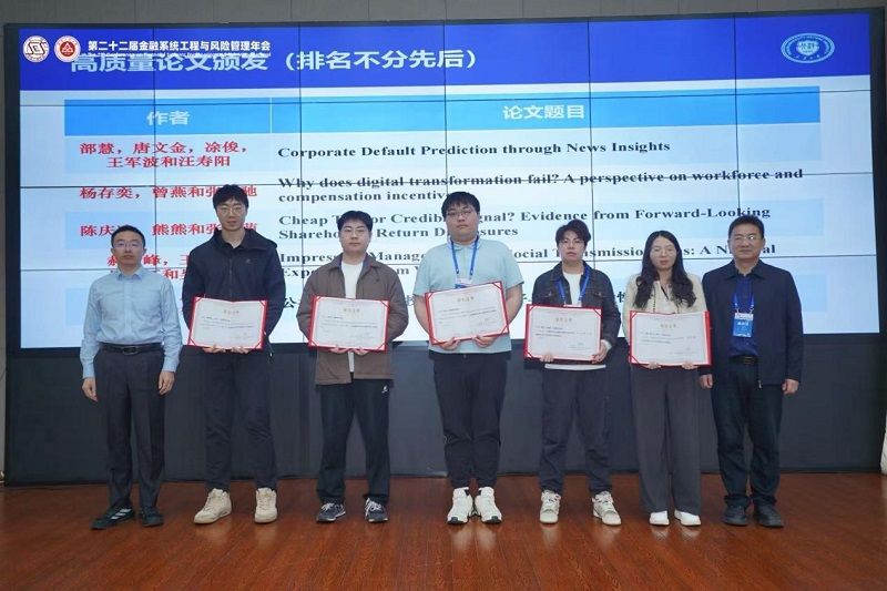 由熊熊教授、博士生陈庆冲、张雨萌合作的论文《Cheap Talk or Credible Signal? Evidence from Forward-Looking Shareholder Return Disclosures》受邀进行汇报。该工作关注于我国上市公司分红频次低、金额少的问题,并讨论了证监会推出的“质量回报双提升”、“提质增效重回报”引起的经济后果。经会务组严格的匿名评审程序,该论文获第二十二届中国金融学年会“沃顿WRDS最佳论文奖”。此前,该工作论文于2025年10月26日在芜湖汇报,被评选为第二十二届金融系统工程与风险管理年会高质量论文(共投稿278篇)。
