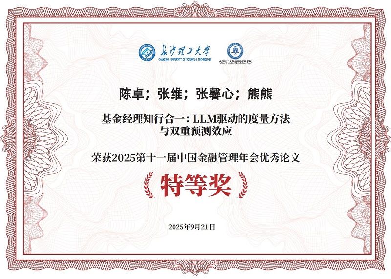 研究成果《基金经理知行合一:LLM驱动的度量方法与双重预测效应》(作者:陈卓博士生、张维教授、张馨心博士生、熊熊教授),在2025年9月20日召开的第十一届中国金融管理年会上荣获会议优秀论文特等奖(共颁发35篇优秀论文,该文为唯一的中文特等奖论文),并于2025年9月21日荣获第十三届商务智能与金融工程国际会议暨第四届金融科技国际会议优秀论文奖。该研究创新性地将前沿的大语言模型(LLM)融入金融文本分析框架,并结合基于风险计量模型的行为测度方法,提出了“知行合一”指标。该指标为预测基金业绩和股市表现提供了重要的信号支持。2025年11月1-2日,第二十二届中国金融学年会在南京大学举办,年会以“范式变革:人工智能重塑金融”为主题。
