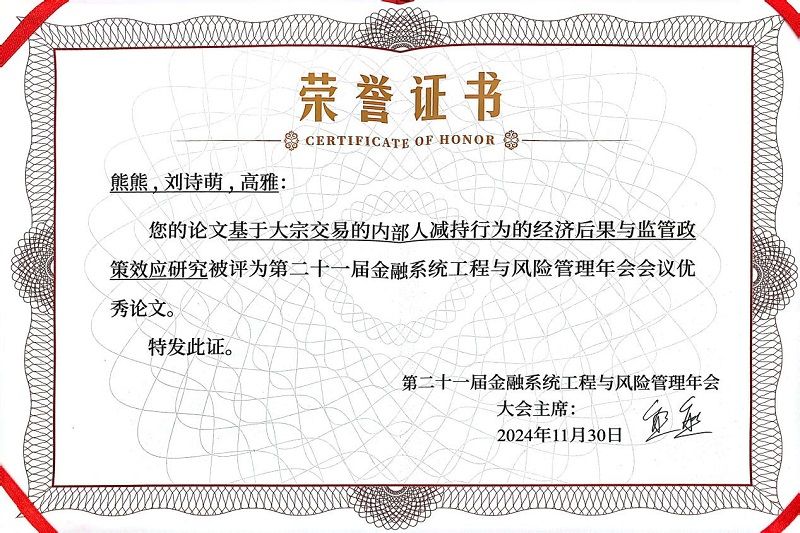团队工作《内部人减持的经济后果与影响机制:基于大宗交易的研究》(作者:熊熊教授、刘诗萌博士生、高雅副教授)于2024年11月30日第二十一届金融系统工程与风险管理年会中获评会议优秀论文(报告论文共240篇)。该工作聚焦于基于大宗交易的内部人减持的经济后果与影响机制,并揭示现有监管政策的优化方向。