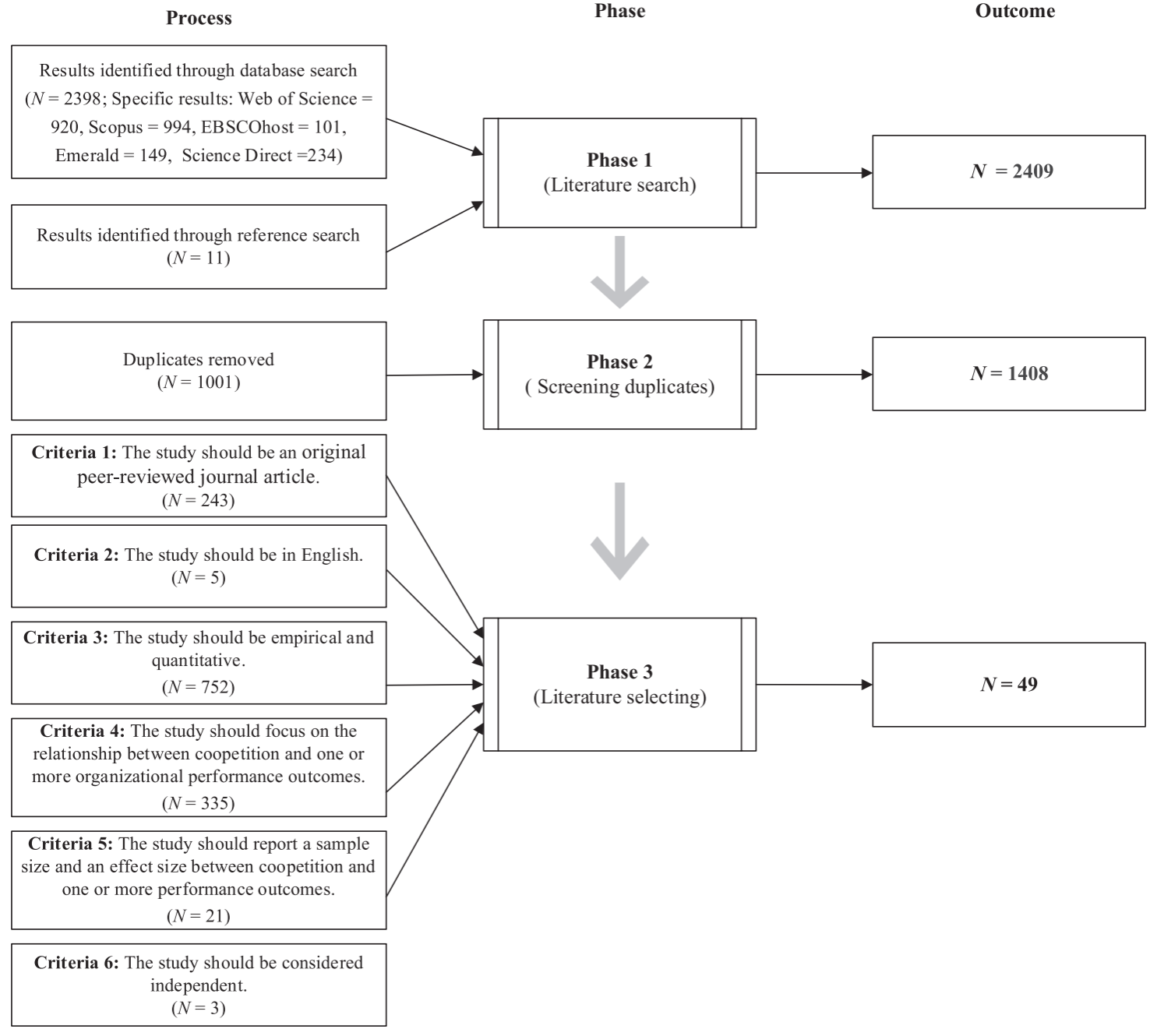 首先,本文探究了竞合与组织的财务、市场、创新和客户绩效等子绩效维度之间的关系,其次我们探讨了两种环境因素(即行业类型和国家文化)、两种组织关系因素(即竞合结构和关系水平)以及两种方法论因素(即竞合和绩效测度)对竞合与组织绩效关系的调节效应。本文使用了49项研究数据,涉及62,057名参与者。具体数据检索过程如图2所示。